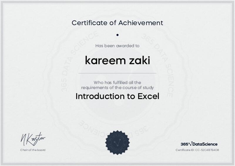 This user has been awarded the Introduction to Excel Certificate for successfully completing the course exam. Holding this certificate demonstrates their proficiency on the topic and signifies they are qualified to apply their newly acquired expertise in the fields of data analytics and data science.
