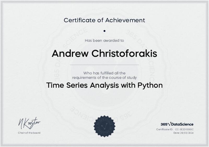 This user has been awarded the Time Series Analysis with Python Certificate for successfully completing the course exam. Holding this certificate demonstrates their proficiency on the topic and signifies they are qualified to apply their newly acquired expertise in the fields of data analytics and data science.