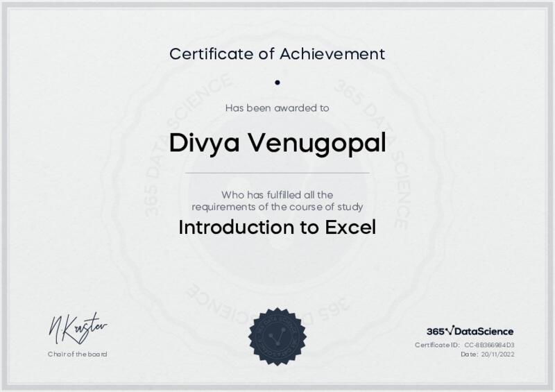 This user has been awarded the Introduction to Excel Certificate for successfully completing the course exam. Holding this certificate demonstrates their proficiency on the topic and signifies they are qualified to apply their newly acquired expertise in the fields of data analytics and data science.