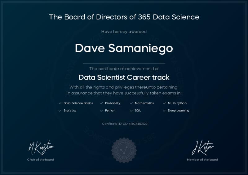 This user has been awarded the Data Scientist Career Track Certificate for successfully completing all courses and assessments. This certificate confirms their technical expertise and professional credibility to work as a data scientist.