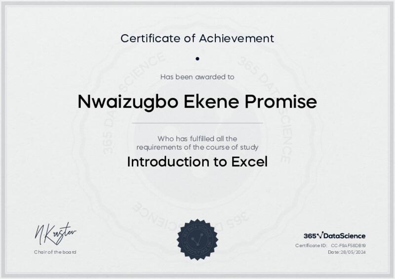 This user has been awarded the Introduction to Excel Certificate for successfully completing the course exam. Holding this certificate demonstrates their proficiency on the topic and signifies they are qualified to apply their newly acquired expertise in the fields of data analytics and data science.