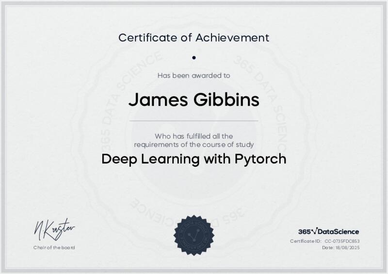 This user has been awarded the Deep Learning with Pytorch Certificate for successfully completing the course exam. Holding this certificate demonstrates their proficiency on the topic and signifies they are qualified to apply their newly acquired expertise in the fields of data analytics and data science.