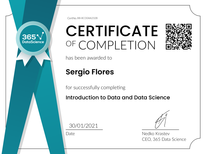 Congratulations! You have been awarded the 365 Data Science Certificate for successfully completing this course. Holding this certificate demonstrates your proficiency on the topic and your ability to apply your newly acquired expertise in the fields of data analytics and data science with confidence.