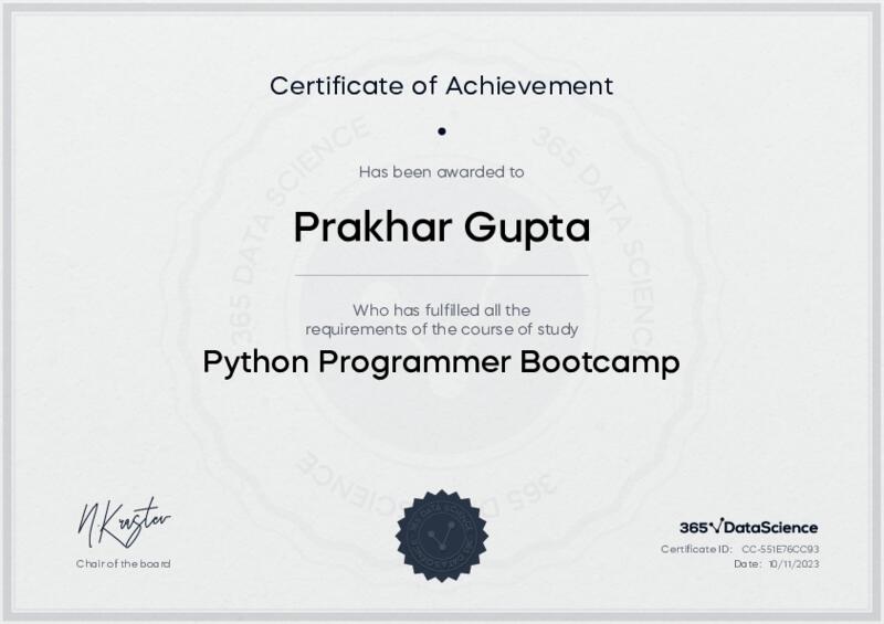This user has been awarded the Python Programmer Bootcamp Certificate for successfully completing the course exam. Holding this certificate demonstrates their proficiency on the topic and signifies they are qualified to apply their newly acquired expertise in the fields of data analytics and data science.