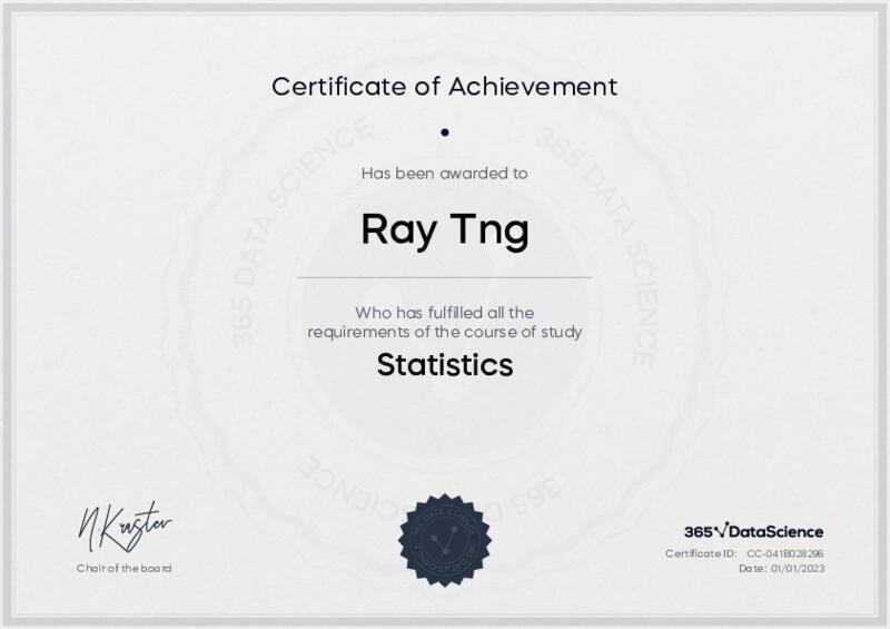 This user has been awarded the Statistics Certificate for successfully completing the course exam. Holding this certificate demonstrates their proficiency on the topic and signifies they are qualified to apply their newly acquired expertise in the fields of data analytics and data science.