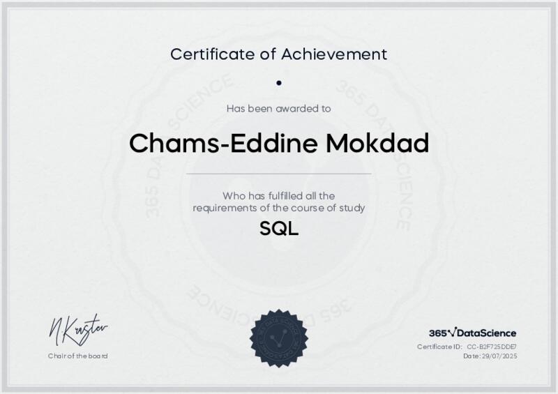 This user has been awarded the SQL Certificate for successfully completing the course exam. Holding this certificate demonstrates their proficiency on the topic and signifies they are qualified to apply their newly acquired expertise in the fields of data analytics and data science.