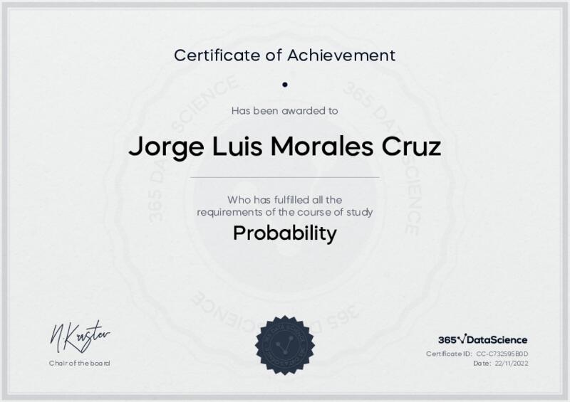 This user has been awarded the Probability Certificate for successfully completing the course exam. Holding this certificate demonstrates their proficiency on the topic and signifies they are qualified to apply their newly acquired expertise in the fields of data analytics and data science.