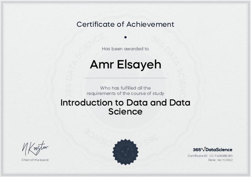This user has been awarded the Introduction to Data and Data Science Certificate for successfully completing the course exam. Holding this certificate demonstrates their proficiency on the topic and signifies they are qualified to apply their newly acquired expertise in the fields of data analytics and data science.