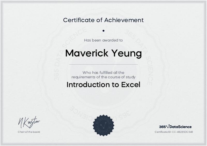 This user has been awarded the Introduction to Excel Certificate for successfully completing the course exam. Holding this certificate demonstrates their proficiency on the topic and signifies they are qualified to apply their newly acquired expertise in the fields of data analytics and data science.