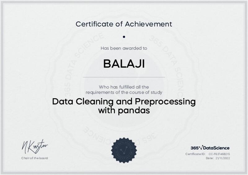 This user has been awarded the Data Cleaning and Preprocessing with pandas Certificate for successfully completing the course exam. Holding this certificate demonstrates their proficiency on the topic and signifies they are qualified to apply their newly acquired expertise in the fields of data analytics and data science.