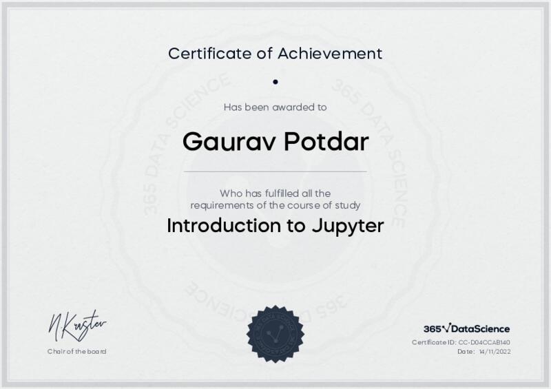 This user has been awarded the Introduction to Jupyter Certificate for successfully completing the course exam. Holding this certificate demonstrates their proficiency on the topic and signifies they are qualified to apply their newly acquired expertise in the fields of data analytics and data science.