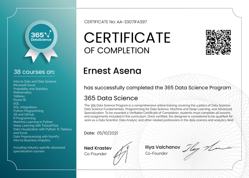 The 365 Data Science Program Certificate is a trusted, globally recognized verification of the expertise possessed by data science professionals. This comprehensive certificate is awarded to graduates who have successfully completed all courses in the program and is a well-earned testament to their proficiency in all major domains of data science. Owning this certification gives them the opportunity to differentiate themselves in today’s highly competitive analytics job market and convey that they are the well-rounded candidates employers are looking for.