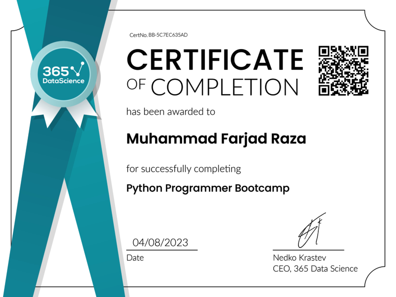 Congratulations! You have been awarded the 365 Data Science Certificate for successfully completing this course. Holding this certificate demonstrates your proficiency on the topic and your ability to apply your newly acquired expertise in the fields of data analytics and data science with confidence.