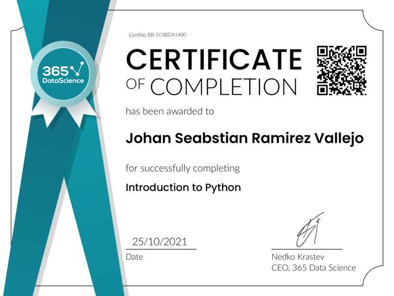 Congratulations! You have been awarded the 365 Data Science Certificate for successfully completing this course. Holding this certificate demonstrates your proficiency on the topic and your ability to apply your newly acquired expertise in the fields of data analytics and data science with confidence.