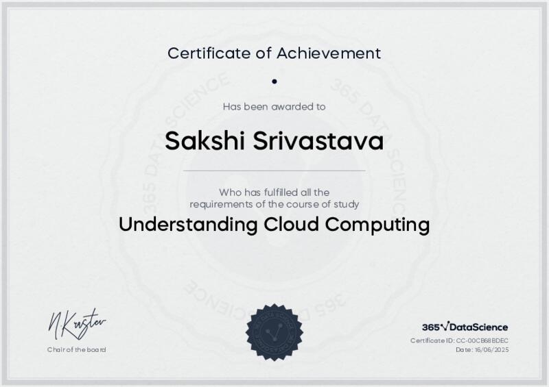 This user has been awarded the Understanding Cloud Computing Certificate for successfully completing the course exam. Holding this certificate demonstrates their proficiency on the topic and signifies they are qualified to apply their newly acquired expertise in the fields of data analytics and data science.