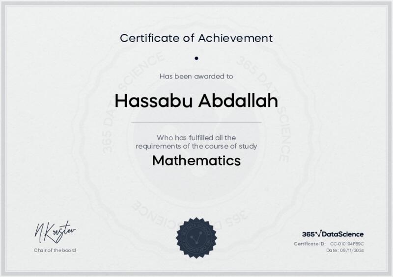 This user has been awarded the Mathematics Certificate for successfully completing the course exam. Holding this certificate demonstrates their proficiency on the topic and signifies they are qualified to apply their newly acquired expertise in the fields of data analytics and data science.