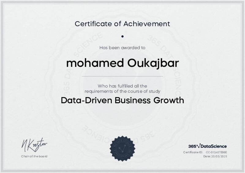 This user has been awarded the Data-Driven Business Growth Certificate for successfully completing the course exam. Holding this certificate demonstrates their proficiency on the topic and signifies they are qualified to apply their newly acquired expertise in the fields of data analytics and data science.