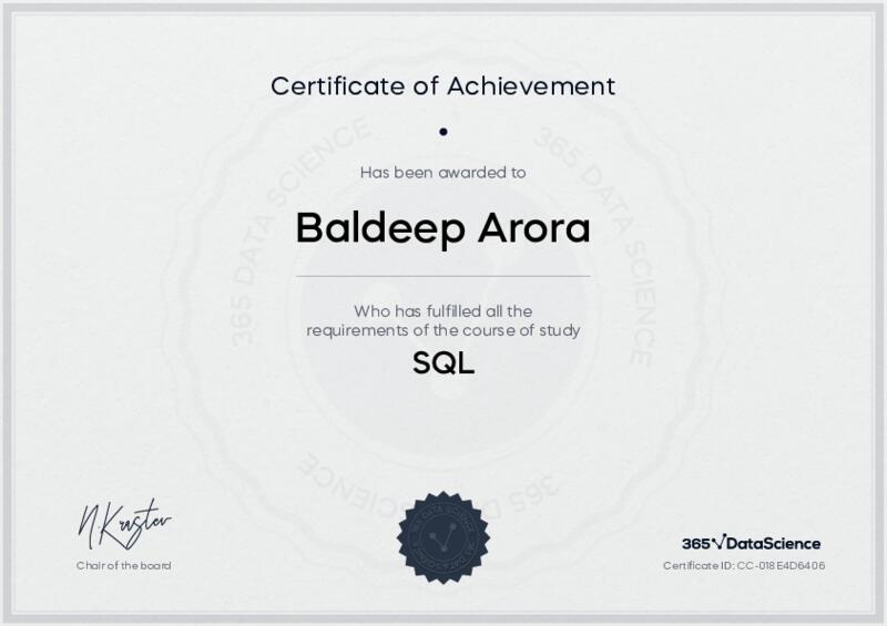 This user has been awarded the SQL Certificate for successfully completing the course exam. Holding this certificate demonstrates their proficiency on the topic and signifies they are qualified to apply their newly acquired expertise in the fields of data analytics and data science.