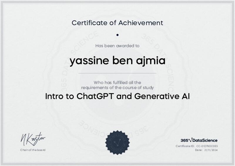 This user has been awarded the Intro to ChatGPT and Generative AI Certificate for successfully completing the course exam. Holding this certificate demonstrates their proficiency on the topic and signifies they are qualified to apply their newly acquired expertise in the fields of data analytics and data science.