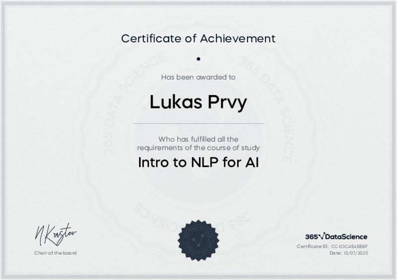 This user has been awarded the Intro to NLP for AI Certificate for successfully completing the course exam. Holding this certificate demonstrates their proficiency on the topic and signifies they are qualified to apply their newly acquired expertise in the fields of data analytics and data science.
