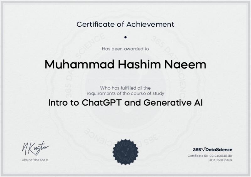 This user has been awarded the Intro to ChatGPT and Generative AI Certificate for successfully completing the course exam. Holding this certificate demonstrates their proficiency on the topic and signifies they are qualified to apply their newly acquired expertise in the fields of data analytics and data science.