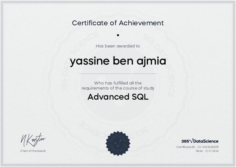 This user has been awarded the Advanced SQL Certificate for successfully completing the course exam. Holding this certificate demonstrates their proficiency on the topic and signifies they are qualified to apply their newly acquired expertise in the fields of data analytics and data science.
