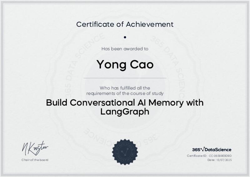 This user has been awarded the Build Conversational AI Memory with LangGraph Certificate for successfully completing the course exam. Holding this certificate demonstrates their proficiency on the topic and signifies they are qualified to apply their newly acquired expertise in the fields of data analytics and data science.