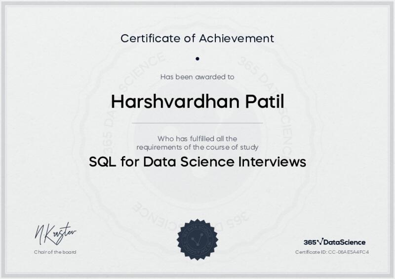 This user has been awarded the SQL for Data Science Interviews Certificate for successfully completing the course exam. Holding this certificate demonstrates their proficiency on the topic and signifies they are qualified to apply their newly acquired expertise in the fields of data analytics and data science.