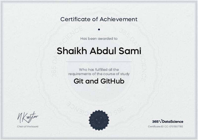 This user has been awarded the Git and GitHub Certificate for successfully completing the course exam. Holding this certificate demonstrates their proficiency on the topic and signifies they are qualified to apply their newly acquired expertise in the fields of data analytics and data science.