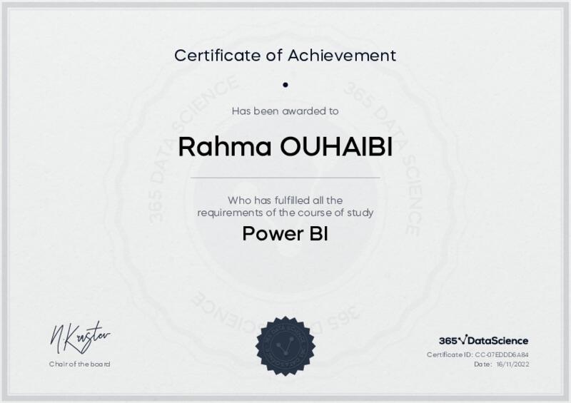 This user has been awarded the Power BI Certificate for successfully completing the course exam. Holding this certificate demonstrates their proficiency on the topic and signifies they are qualified to apply their newly acquired expertise in the fields of data analytics and data science.