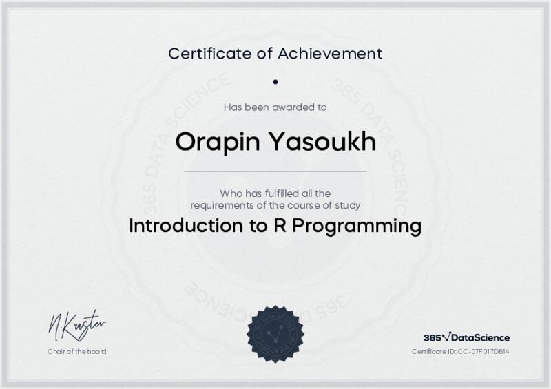 This user has been awarded the Introduction to R Programming Certificate for successfully completing the course exam. Holding this certificate demonstrates their proficiency on the topic and signifies they are qualified to apply their newly acquired expertise in the fields of data analytics and data science.