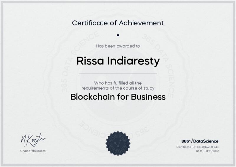 This user has been awarded the Blockchain for Business Certificate for successfully completing the course exam. Holding this certificate demonstrates their proficiency on the topic and signifies they are qualified to apply their newly acquired expertise in the fields of data analytics and data science.