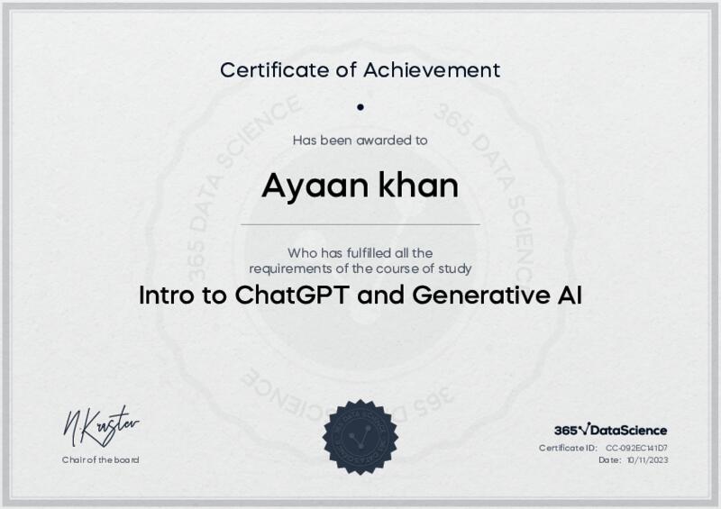 This user has been awarded the Intro to ChatGPT and Generative AI Certificate for successfully completing the course exam. Holding this certificate demonstrates their proficiency on the topic and signifies they are qualified to apply their newly acquired expertise in the fields of data analytics and data science.