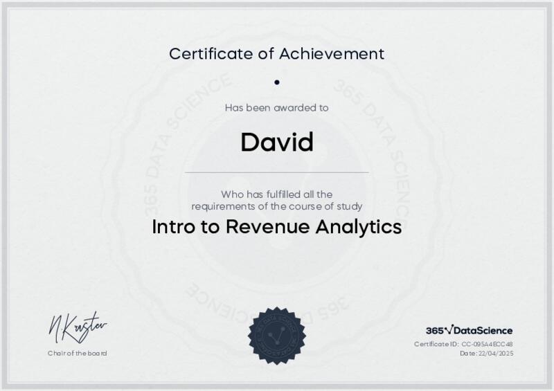 This user has been awarded the Intro to Revenue Analytics Certificate for successfully completing the course exam. Holding this certificate demonstrates their proficiency on the topic and signifies they are qualified to apply their newly acquired expertise in the fields of data analytics and data science.