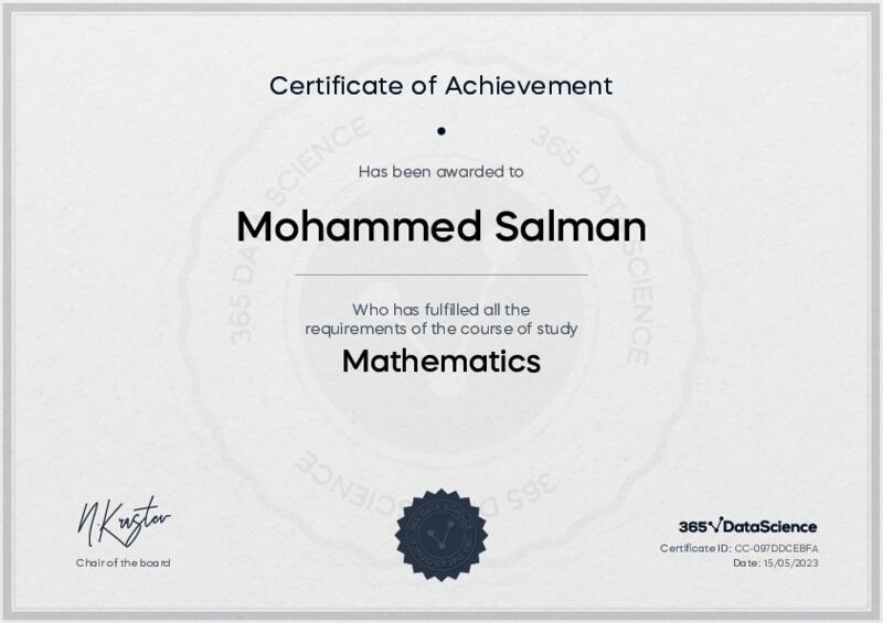 This user has been awarded the Mathematics Certificate for successfully completing the course exam. Holding this certificate demonstrates their proficiency on the topic and signifies they are qualified to apply their newly acquired expertise in the fields of data analytics and data science.