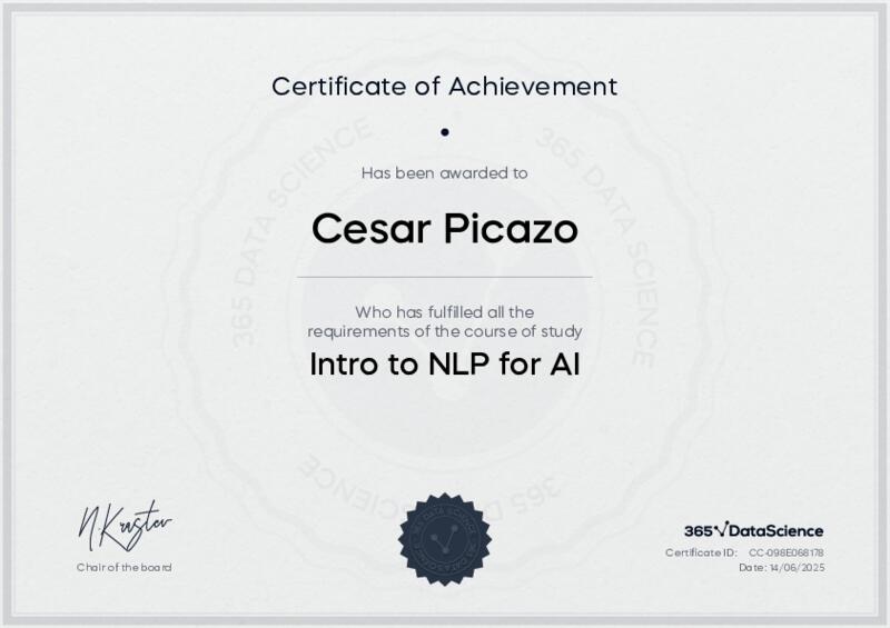 This user has been awarded the Intro to NLP for AI Certificate for successfully completing the course exam. Holding this certificate demonstrates their proficiency on the topic and signifies they are qualified to apply their newly acquired expertise in the fields of data analytics and data science.
