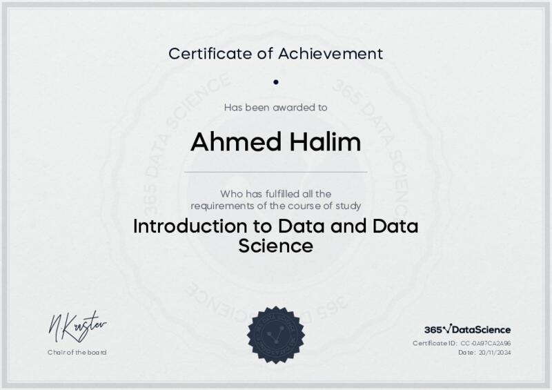 This user has been awarded the Introduction to Data and Data Science Certificate for successfully completing the course exam. Holding this certificate demonstrates their proficiency on the topic and signifies they are qualified to apply their newly acquired expertise in the fields of data analytics and data science.