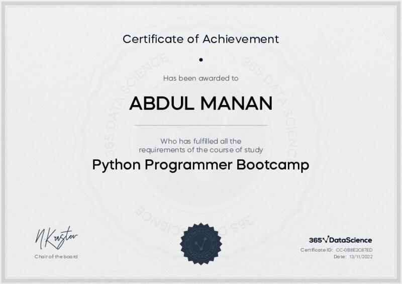 This user has been awarded the Python Programmer Bootcamp Certificate for successfully completing the course exam. Holding this certificate demonstrates their proficiency on the topic and signifies they are qualified to apply their newly acquired expertise in the fields of data analytics and data science.