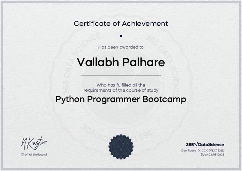 This user has been awarded the Python Programmer Bootcamp Certificate for successfully completing the course exam. Holding this certificate demonstrates their proficiency on the topic and signifies they are qualified to apply their newly acquired expertise in the fields of data analytics and data science.