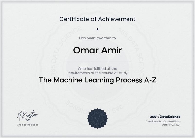 This user has been awarded the The Machine Learning Process A-Z Certificate for successfully completing the course exam. Holding this certificate demonstrates their proficiency on the topic and signifies they are qualified to apply their newly acquired expertise in the fields of data analytics and data science.
