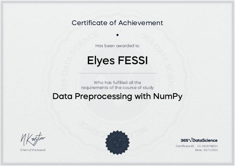 This user has been awarded the Data Preprocessing with NumPy Certificate for successfully completing the course exam. Holding this certificate demonstrates their proficiency on the topic and signifies they are qualified to apply their newly acquired expertise in the fields of data analytics and data science.