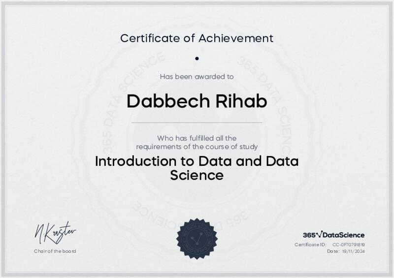 This user has been awarded the Introduction to Data and Data Science Certificate for successfully completing the course exam. Holding this certificate demonstrates their proficiency on the topic and signifies they are qualified to apply their newly acquired expertise in the fields of data analytics and data science.