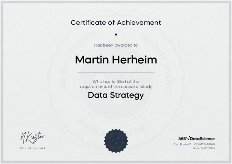 This user has been awarded the Data Strategy Certificate for successfully completing the course exam. Holding this certificate demonstrates their proficiency on the topic and signifies they are qualified to apply their newly acquired expertise in the fields of data analytics and data science.