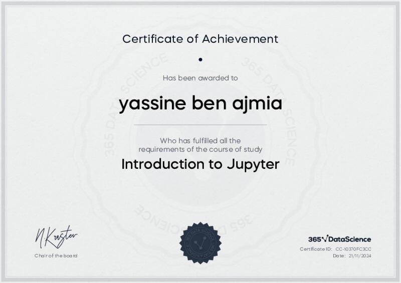 This user has been awarded the Introduction to Jupyter Certificate for successfully completing the course exam. Holding this certificate demonstrates their proficiency on the topic and signifies they are qualified to apply their newly acquired expertise in the fields of data analytics and data science.