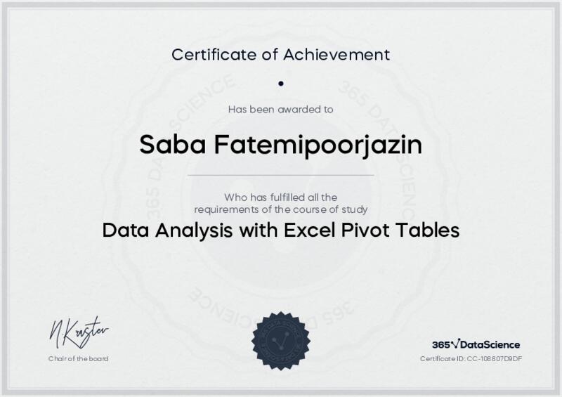 This user has been awarded the Data Analysis with Excel Pivot Tables Certificate for successfully completing the course exam. Holding this certificate demonstrates their proficiency on the topic and signifies they are qualified to apply their newly acquired expertise in the fields of data analytics and data science.