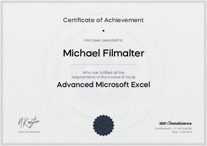 This user has been awarded the Advanced Microsoft Excel Certificate for successfully completing the course exam. Holding this certificate demonstrates their proficiency on the topic and signifies they are qualified to apply their newly acquired expertise in the fields of data analytics and data science.