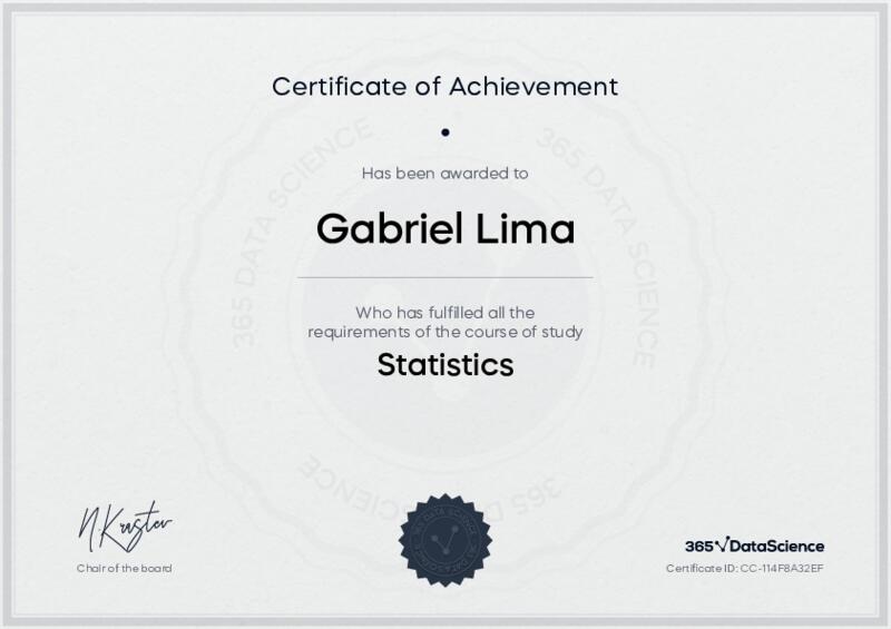 This user has been awarded the Statistics Certificate for successfully completing the course exam. Holding this certificate demonstrates their proficiency on the topic and signifies they are qualified to apply their newly acquired expertise in the fields of data analytics and data science.