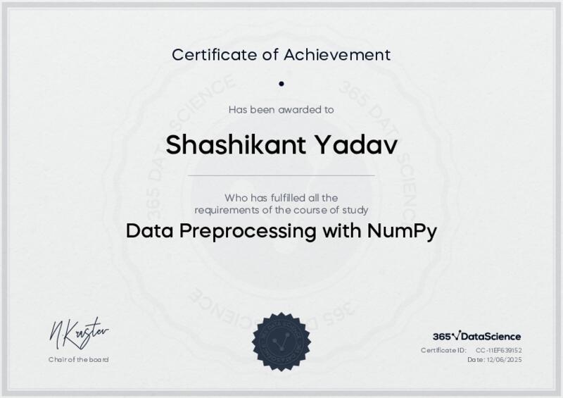 This user has been awarded the Data Preprocessing with NumPy Certificate for successfully completing the course exam. Holding this certificate demonstrates their proficiency on the topic and signifies they are qualified to apply their newly acquired expertise in the fields of data analytics and data science.