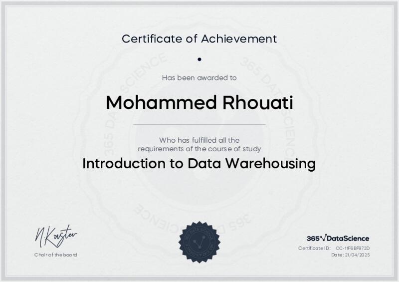 This user has been awarded the Introduction to Data Warehousing Certificate for successfully completing the course exam. Holding this certificate demonstrates their proficiency on the topic and signifies they are qualified to apply their newly acquired expertise in the fields of data analytics and data science.