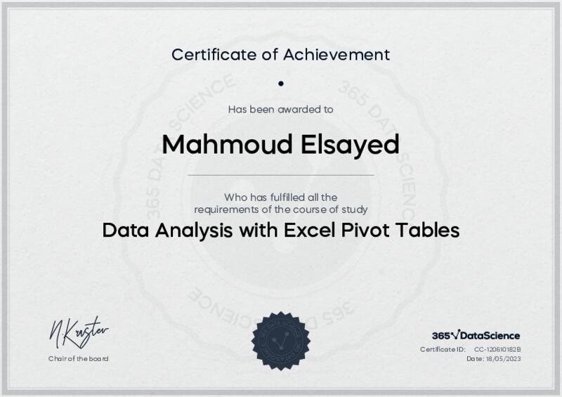 This user has been awarded the Data Analysis with Excel Pivot Tables Certificate for successfully completing the course exam. Holding this certificate demonstrates their proficiency on the topic and signifies they are qualified to apply their newly acquired expertise in the fields of data analytics and data science.